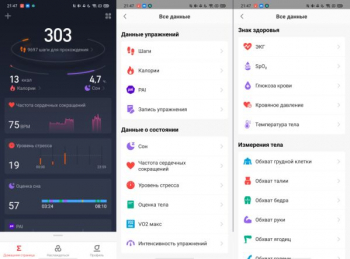 На главном экране отображается краткая сводка за день: активность, частота пульса, уровень кислорода, тренировки, уровень стресса, индекс PAI, оценка сна и так далее. Часть данных будет «подтягиваться» с браслета, другие придется либо вводить вручную, либо использовать дополнительные совместимые девайсы, например, умные весы. Для синхронизации, достаточно просто выполнить смахивание вниз, а прикосновение к каждому пункту выведет расширенные сведенья, где можно также проанализировать информацию за определенный промежуток времени. Здесь все построено четко и логично. В других разделах собраны различные настройки гаджета.