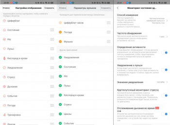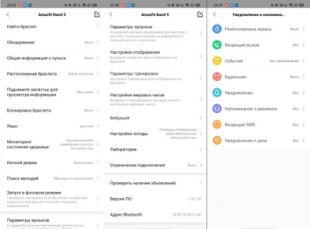 Здесь же активируется отображение смс-сообщений и входящих звонков, которые можно сбрасывать или приглушать, но возможность отвечать на них с браслета не предусмотрена. Раздел «Мониторинг состояния здоровья» позволяет настраивать интервалы измерения пульса, автоматически уменьшая их во время повышенной активности, активировать отслеживание дыхания и фаз во время сна, а также включить уведомления об аномально высоком пульсе.