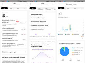 На главном экране отображается краткая сводка за день: активность, частота пульса, уровень кислорода, тренировки, уровень стресса, индекс PAI, оценка сна и так далее. Часть данных будет «подтягиваться» с браслета, другие придется либо вводить вручную, либо использовать дополнительные совместимые девайсы, например, умные весы. Для синхронизации, достаточно просто выполнить смахивание вниз, а прикосновение к каждому пункту выведет расширенные сведенья, где можно также проанализировать информацию за определенный промежуток времени. Здесь все построено четко и логично. В других разделах собраны различные настройки гаджета.