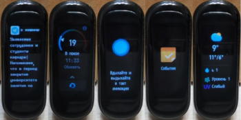 В «Уведомления» складируются поступившие сообщения: длина у них не ограничена, но вот отображать эмодзи, браслет так и не научился. В контейнер «События» отправляются установленные пользователем «напоминалки». Еще одна интересная опция называется «Дыхание». Здесь не производится замеров: просто показывается пульсирующая картинка, которая говорит, когда делать вдох, а когда выдох. С виду малополезная функция, на деле же она помогает быстро восстановить дыхание после интенсивной нагрузки. В «Погоде» отображаются, синхронизированные с вашим местоположением, данные о текущей обстановке на улице, а также прогноз на неделю.