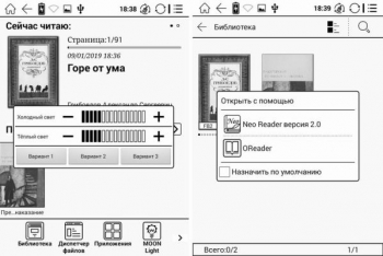 В список доступных приложений входят сразу две читалки – это полюбившаяся многим OReader и новая NeoReader. Пользователь сам решает, какой ридер ему использовать – для выбора нужно коснуться с задержкой пиктограммы нужной книжки и в выпавшем меню выбрать пункт «Открыть с помощью». Все, как на компьютере с Windows – даже можно назначить приложение по умолчанию.
