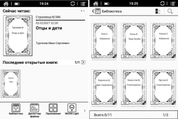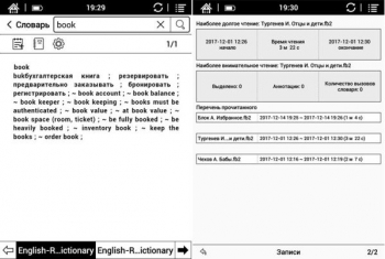 В интерфейсе есть библиотека для удобного доступа ко всем сохраненным в памяти книгам, диспетчер файлов (аналог Проводника в Андроиде), а также предустановленные приложения словаря и статистики чтения. Словарь нужен для быстрого поиска значения или перевода нового слова, взятого прямо из текста книги, или же можно вписать в строку поиска любое нужное слово вручную. Доступные языки – английский и русский. Статистика чтения позволяет отслеживать количество минут и часов, проведенных за чтением книги, а также количество прочитанных страниц за тот или иной период времени.