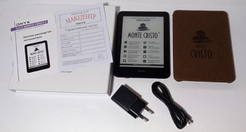 Ридер Onyx Boox Monte Cristo 3 располагает расширенной по сегодняшним меркам комплектацией, так как в дополнение к традиционным аксессуарам у него есть еще и фирменный весьма добротный и качественный чехол. Помимо него, в коробке найдены дата-кабель microUSВ 2.0 для зарядки и синхронизации с ПК, сетевое зарядное устройство с силой тока 1 ампер, инструкция по эксплуатации и гарантийный талон.