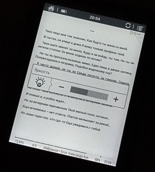 Подсветка Moon Light располагает очень плавной регулировкой яркости – можно подобрать оптимальную для любого внешнего освещения. Комфортное чтение субъективно обеспечивается на уровне от 20 до 60%, а если ставить более высокое время, ощущается повышенная нагрузка на глаза.
