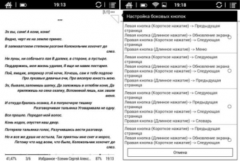 Управление процессом чтения осуществляется боковыми кнопками, функционал которых тоже поддается настройке в соответствующем меню книги. Также листать страницы можно при помощи сенсорного экрана – касание у правого края листает вперед, а у левого, соответственно, назад.