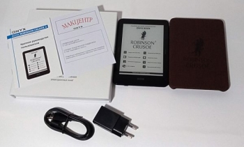 Onyx BOOX Robinson Crusoe 2 поставляется в комплекте с дата-кабелем и зарядным устройством и заодно с гарантийным талоном и инструкцией по эксплуатации. Кабель получил коннектор microUSB, ЗУ выдает силу тока 1 ампер, а инструкция содержит массу полезных сведений – советуем уделить особое внимание расположению кнопок управления.