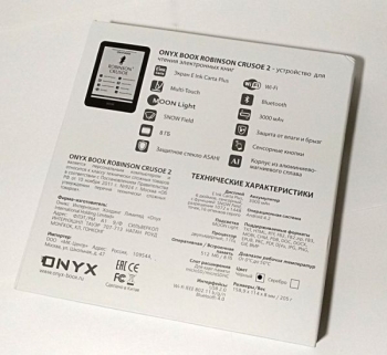Продается Onyx BOOX Robinson Crusoe 2 в сравнительно небольшой коробке из очень плотного картона. Цветов здесь всего два – белый для фона и черный для цвета, что, вероятно, символизирует монохромность экрана на электронных чернилах, но также способствует лучшему усвоению информации.