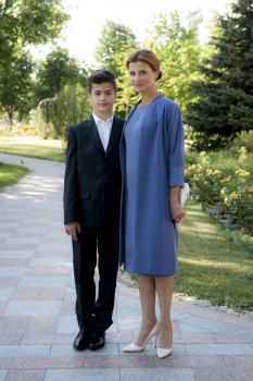 Для своего первого появления на публике в качестве первой леди Зеленская выбрала молочный костюм украинского бренда ARTEMKLIMCHUK. Костюм состоит из платья-миди и жакета-кейпа из шелково-шерстяной ткани. Рукава платья и кейпа вышиты по традиционной украинской технике. Это адаптация флористических и анималистических мотивов с ковров начала XIX века.
