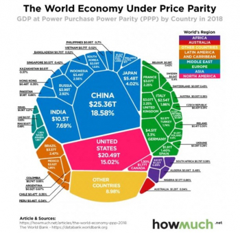 На графике показано, как распределятся ВВП мира по странам и регионам. Размер страны в визуализации пропорционален ее относительному ВВП по паритету покупательной способности. Страны также имеют цветовую кодировку по континентам, чтобы проиллюстрировать географическое распределение мирового производства. Все значения выражены в долларах США.