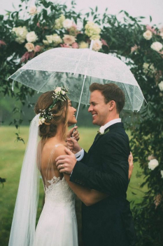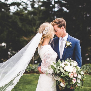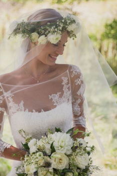 А вот для обладательниц коротких волос идеальной свадебной прической с фатой послужит милый венок из живых цветов.