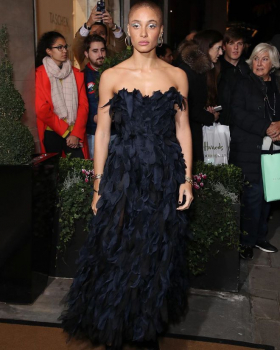 Модели Адвоа Абоа вручили статуэтку «Прорыв года». Для получения награды она выбрала черное платье в пол из осенней коллекции MarcJacobs 2019 года, расшитое перьями.