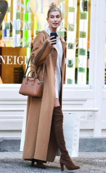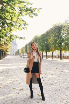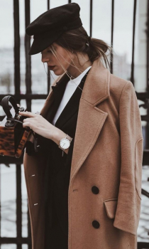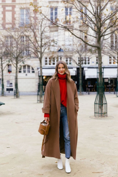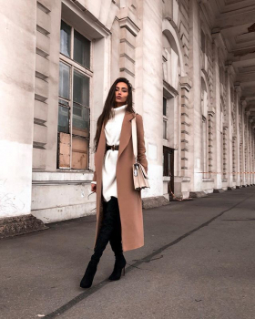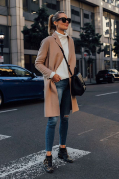 Минусов такого пальто мы не нашли, поэтому давай сразу перейдем к модным аутфитам, с которыми можно сочетать пальто песочного оттенка.