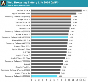 Как показали исследования, новый Samsung Galaxy S9 на 9810 работает без подзарядки заметно меньше в сравнении с аналогом на 845-м Snapdragon от Qualcomm – все результаты приведены в приложенной таблице. Авторы сравнительного теста пока не могут сказать, в чем именно кроется проблема S9 на 9810, но разница во времени автономной работы существенная. Возможно, в будущем это вылечится новой прошивкой, или же проблема скрыта в аппаратной начинке, и устранить ее так просто уже не получится.