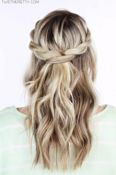 Ты можешь выполнять подобную прическу, используя три пряди, или просто закрутить волосы в жгуты и закрепить их на затылке с помощью невидимок.