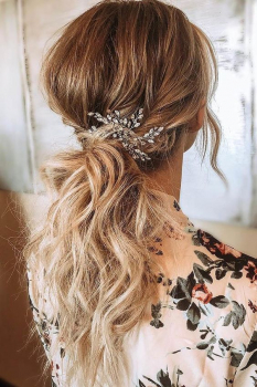 Необычная вариация низкого хвоста – хвост с косичкой. Чтобы повторить эту прическу, сделай пробор на одну сторону. Там, где волос больше, начни заплетать вывернутую французскую косу. Раздели волосы на три пряди, и вплетай их не внутрь, а другом под другом. Постепенно добавляй небольшие пряди, пока у тебя не получится косичка. Для придания объема немного распуши косичку. Завяжи низкий хвост вместе с получившейся косичкой. Следы резинки спрячь с помощью маленькой пряди волос и невидимки. Накрути волосы в хвосте на плойку или утюжок.