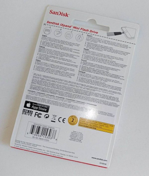 SanDisk Ixpand Mini поставляется в тонкой упаковке из картона, внутри которой есть небольших размеров пластиковый блистер. Ничего особенного в данном типе упаковки нет, кроме того, что на ней поместилось подробное описание самого накопителя.