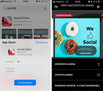 Тестирование SanDisk Ixpand Mini проводилось на смартфоне iPhone 5S. Моноблок распознал флешку сразу после подключения и предложил установить фирменное приложение из магазина App Store. Это вынужденная мера – в Apple iOS по умолчанию нет поддержки флеш-драйвов, и их работа возможна только при использовании дополнительного программного обеспечения.