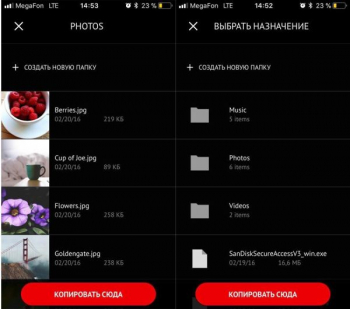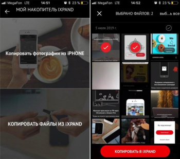 Программа Ixpand Drive устроена максимально просто – прямо на главном экране она предлагает скопировать файлы из памяти гаджета на накопитель или из накопителя в гаджет. Последнее пригодится, например, когда нужно быстро перенести данные с компьютера в смартфон – сначала копируем их на флешку, затем вставляем ее в смартфон и повторяем процедуру копирования.
