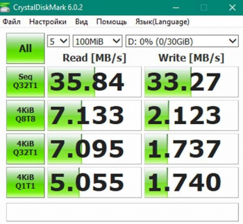 Тестирование скорости мы проводили в программе CrystalDiskInfo самой актуальной на момент публикации статьи версии. При подключении накопителя к USB 3.0 скорость чтения достигла почти 36 МБ/с, а скорость записи превысила 33 МБ/с. Что примечательно, переход к использованию более медленного USB 2.0 на результатах замеров никак не отразился.