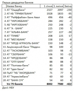 Напомним, за 2019 год украинские банки закрыли 507 отделений. По состоянию на 1 января 2020 года их насчитывалось 8002. Таким образом, за полгода закрылось еще 422 отделения банков.