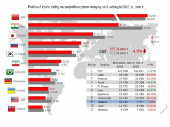 По ее данным, выплавка чугуна в Украине за отчетный период снизилась на 2,6% по сравнению с тем же периодом 2019 года, до 9,98 млн т. В целом за январь-июнь выплавка чугуна в мире сократилась на 4,35%, до 633,36 млн т.