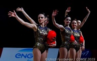 Наша сборная в составе Анастасии Возняк, Валерии Юзьвяк, Дианы Мижерицкой, Алины Быхно, Татьяны Довженко и Мариы Высочанской показала лучший результат в упражнениях с 5 мячами, выиграли серебро с 3 обручами/2 парами булав и бронзу в многоборье.